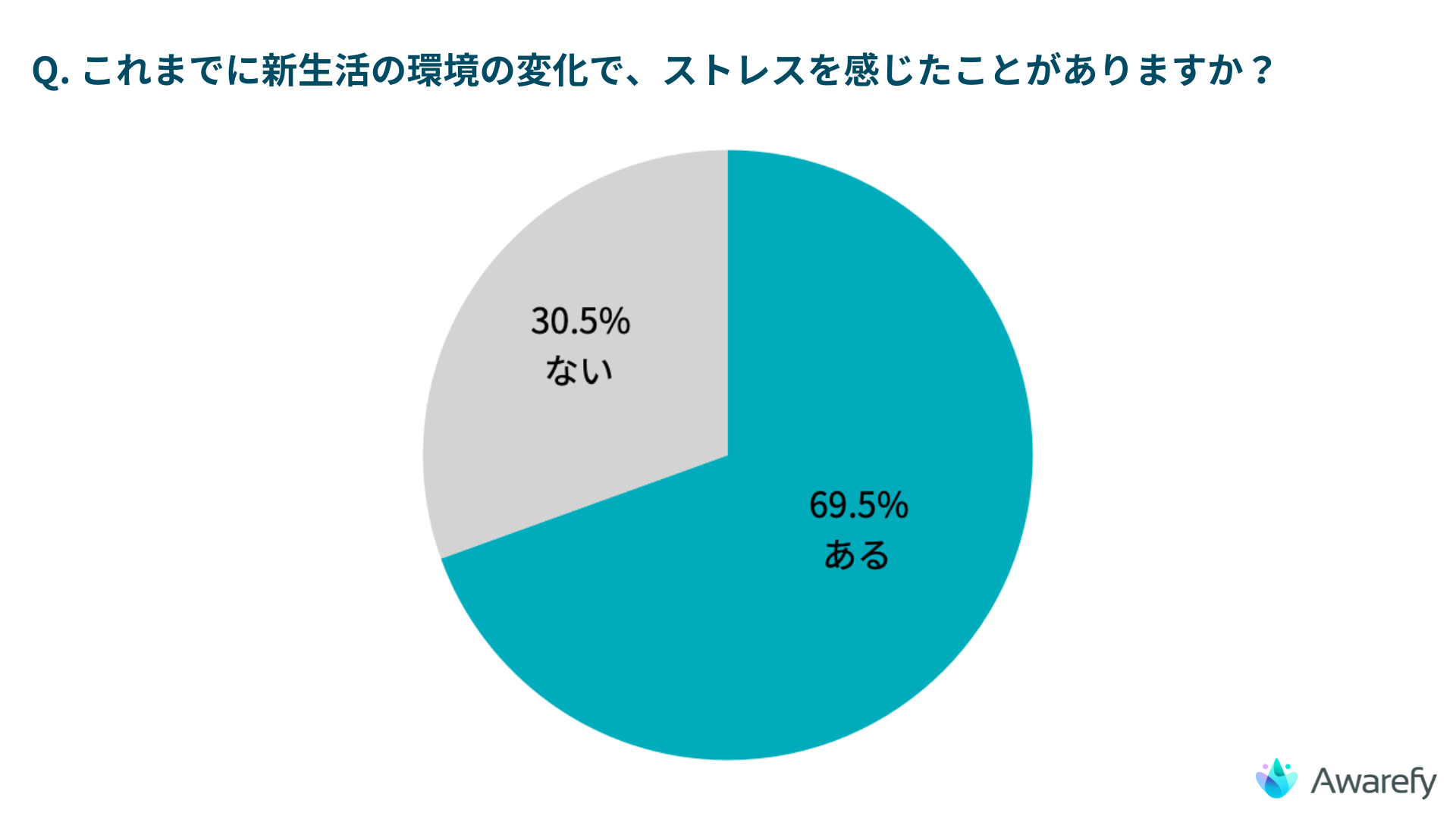 心のセルフケア・アプリ 『Awarefy(アウェアファイ)』を運営する株式会社Hakaliが実施した「新生活のストレス」についてアンケート調査によれば、「新生活の環境の変化でストレスを感じたことがあるか?」との問いかけには、約7割(69.5%)の人が「ある」と回答しました。