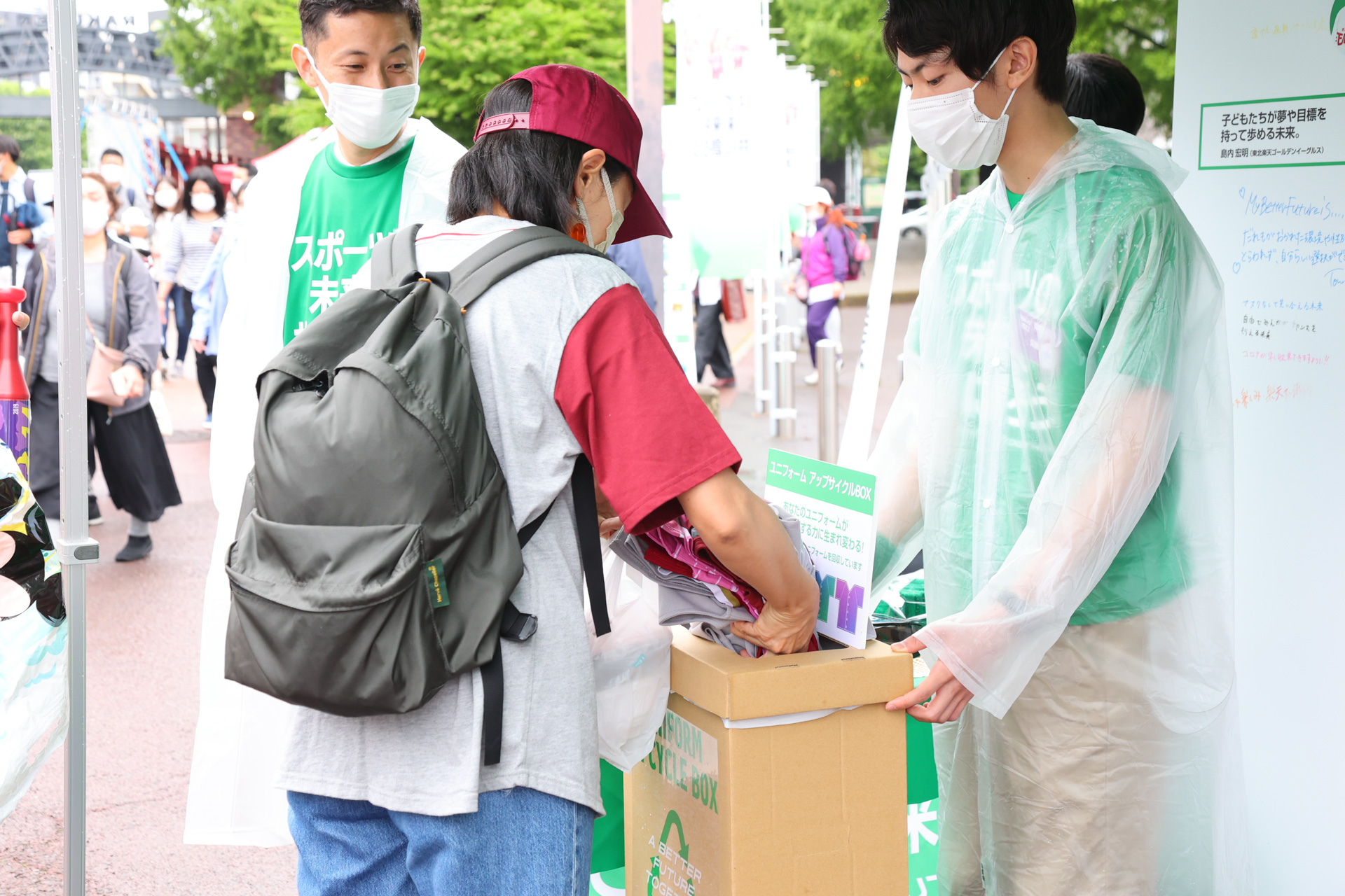 ▲もう着なくなった古いユニフォームを回収する箱を設置。回収したユニフォームは、選手たちを後押しするアイテムにアップサイクルされる予定だそう。