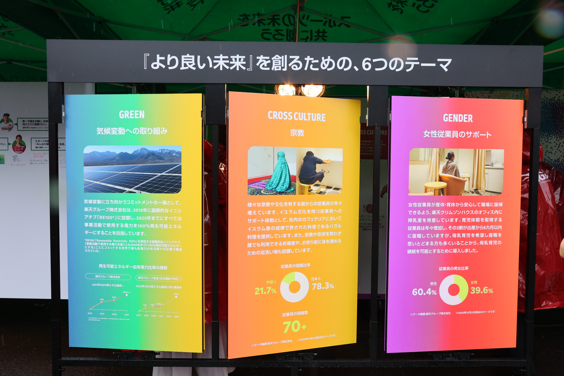 当日、会場の特設ブースでは、6つのテーマに分けてイベントやアクティビティ、展示が行われました。楽天グループが推進するダイバーシティ(LGBTQ+ / GENDER /PEOPLE WITH DISABILITIES / CROSS CULTURE / FAMILY)とGREEN(環境・社会・経済)について理解促進を図る狙いです。