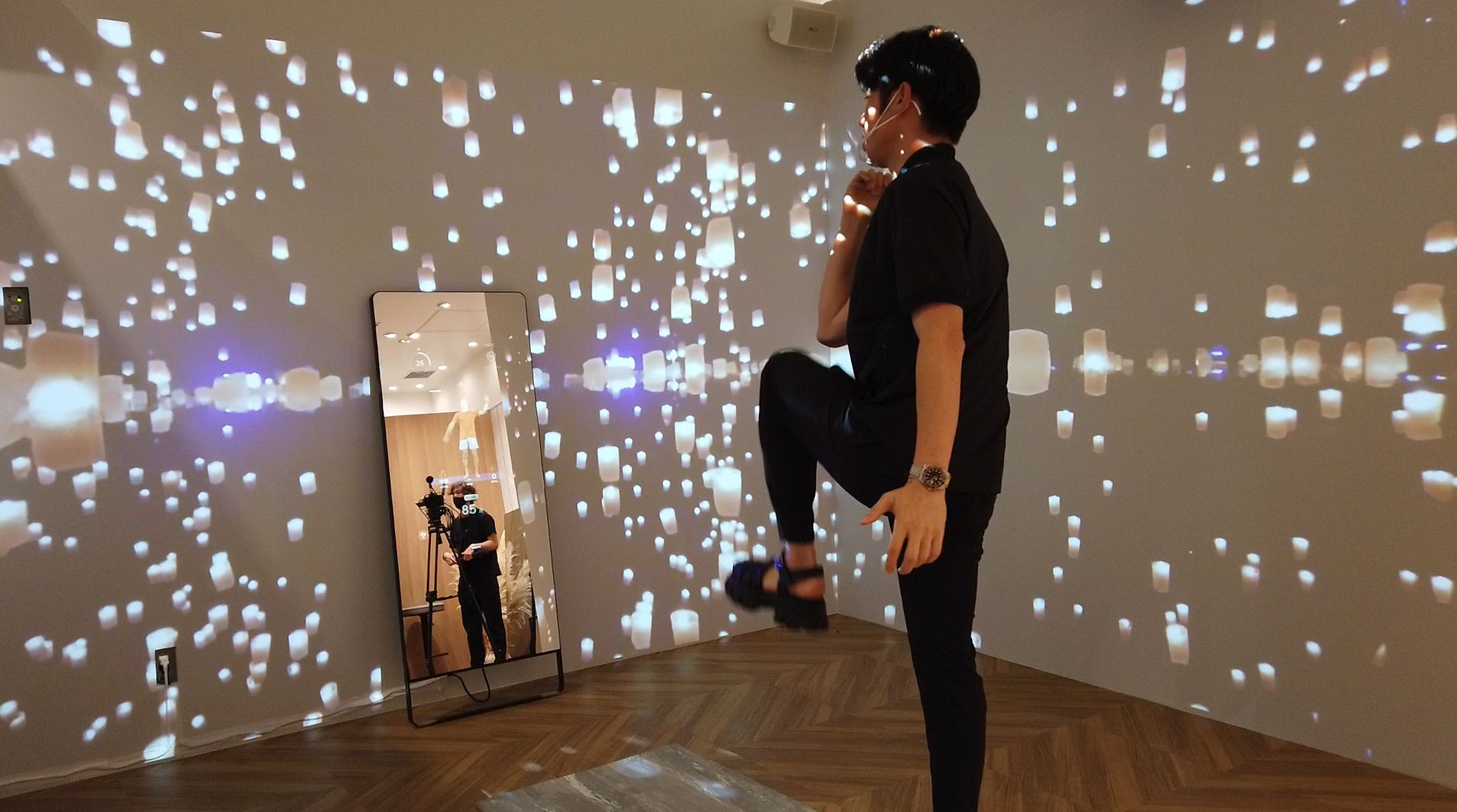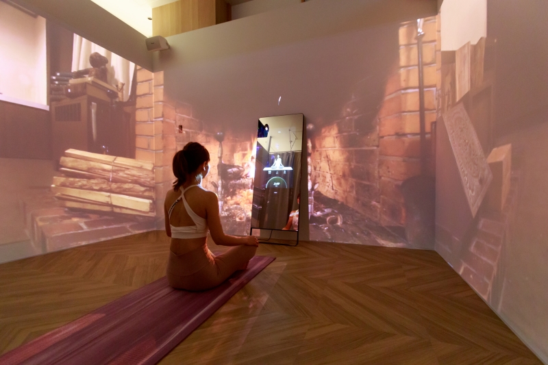 個室では、壁全面に迫力あるプロジェクターの映像を投影し、没入感を味わいながらMIRROR FIT.を使ったフィットネスを楽しめます。