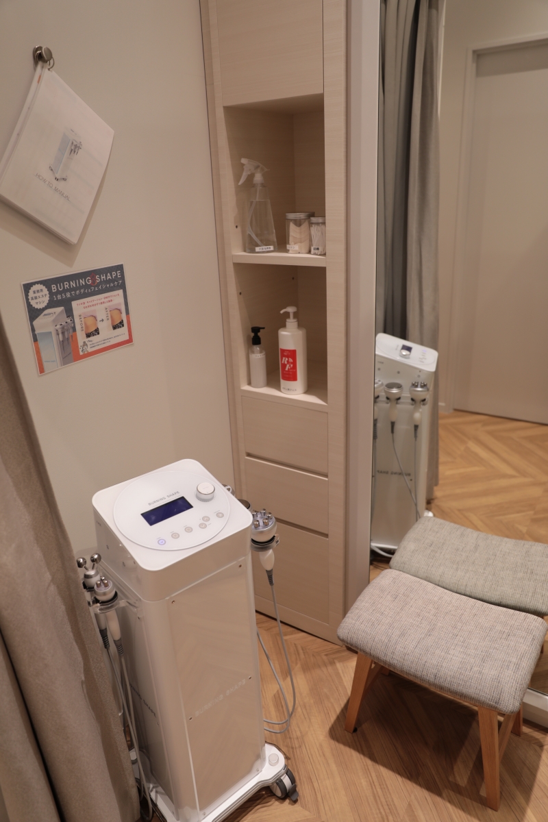 さらに、セルフエステができるスペースも完備。大手エステサロンでも使われるハイスペックなマシンが導入され、ボディやフェイシャルともに脂肪へアプローチする機能を搭載しています。大きな鏡のある明るい空間で、気になる部分をケアできます。