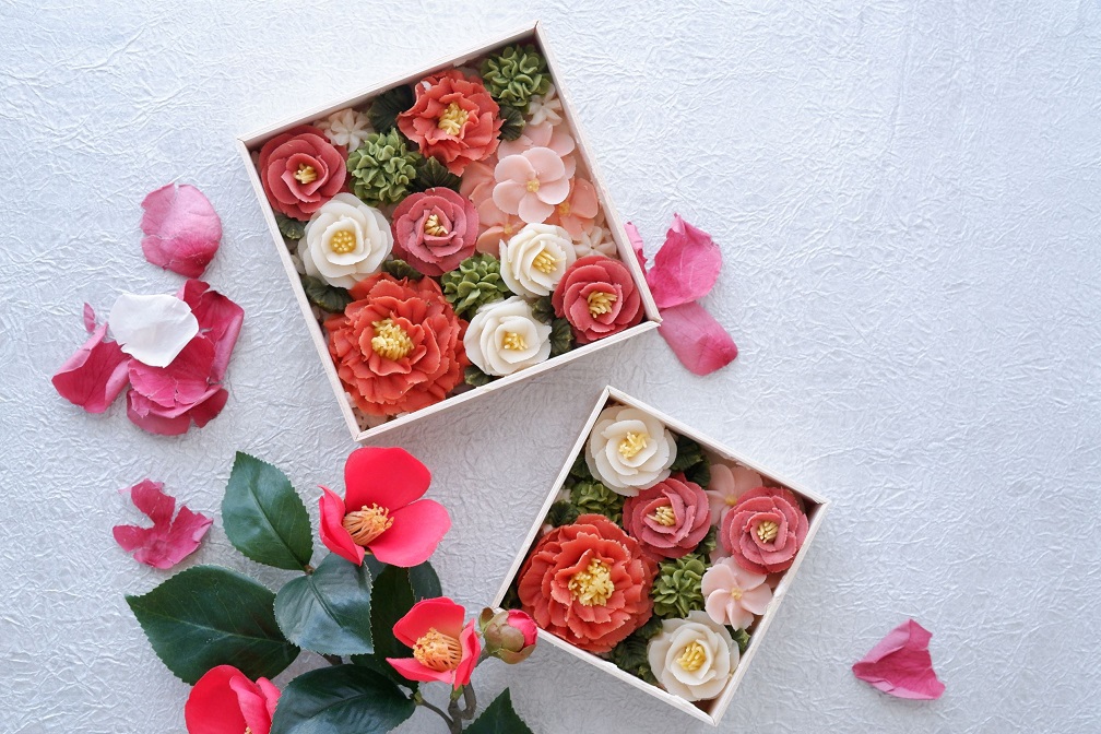 「あんこのお花」は、天然着色料で着色した白餡を、高度な技術で本物のお花のような形に仕上げたもの。もち米や乳製品・小麦粉不使用のケーキなどの上にデコレーションをした美しい和菓子です。