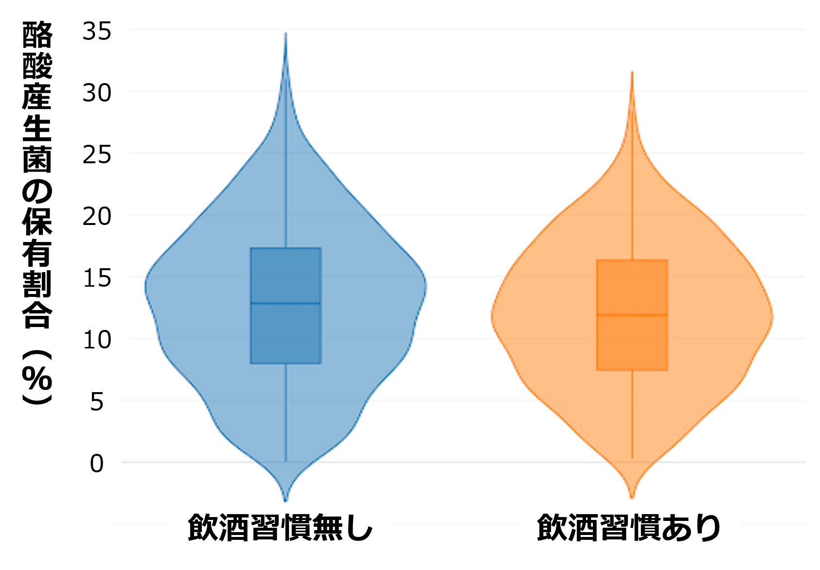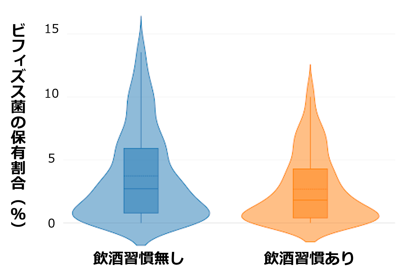 両者の保有菌を比較したところ、飲酒習慣のある人のほうがビフィズス菌、酪酸産生菌の保有割合が少ないことが分かったといいます。