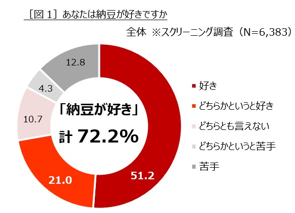 まずは、日本人の納豆事情から。タカノフーズが実施したインターネット調査によれば、日本人の納豆好きはホンモノ。なんと、7割を超える人たちが「納豆が好き」と答えています。