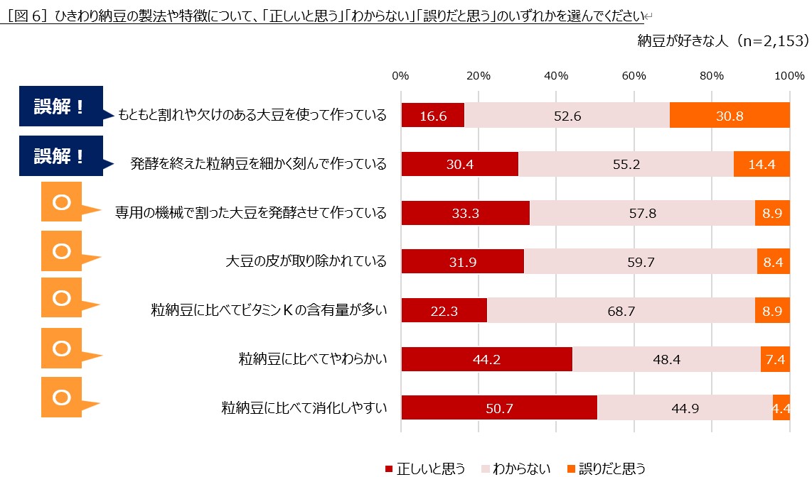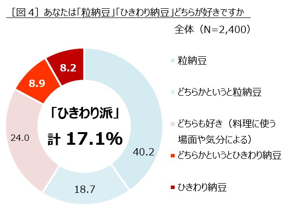 なお、調査では「粒納豆」と「ひきわり納豆」のどちらが好きかを聞くと、「ひきわり派」は17.1%(「ひきわり納豆」「どちらかというとひきわり納豆」の合計)と約2割でしたが、「たまたま食べてみたらおいしかったから」という声もあるように、今後認知度などがさらに高まる可能性もありますね。