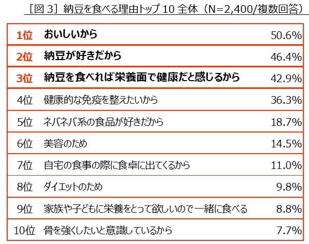 ちなみに、納豆を食べる理由では、1位は「おいしいから」(50.6%)、2位「納豆が好きだから」(46.4%)が多く、味を評価する人が多いことがわかります。