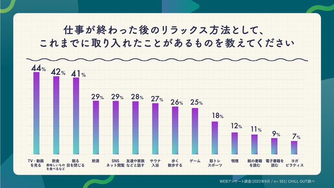 リラクゼーションドリンクブランド「CHILL OUT(チルアウト)」は、全国の20〜49歳の会社員・公務員を対象に、リラックス習慣に関する調査を実施しました。