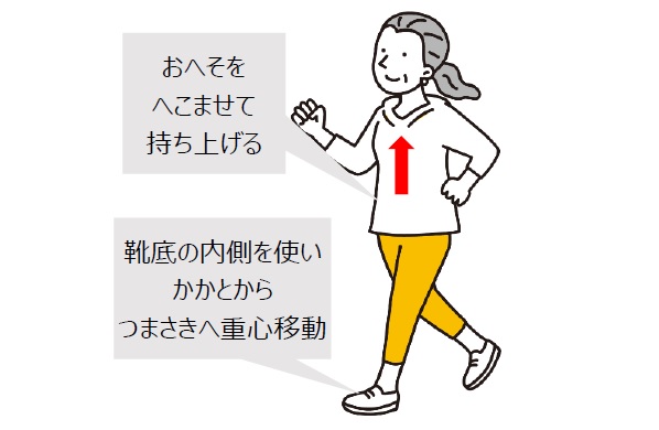 「靴底の内側を使って、かかとからつま先に重心を移しながら脚を運びます。力を抜くとかかとの外側から着地して歩くので腹筋を使ってお腹の引き上げを意識しましょう。腹筋を使うと、太腿の内側の内転筋が締められるので、O脚が防げます」(丸山院長)