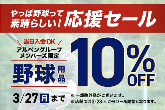 アルペンは、2023年3月27日(月)までの期間中、同社会員限定で野球用品を10%オフで購入できる「やっぱ野球って素晴らしい!応援セール」を実施しています。