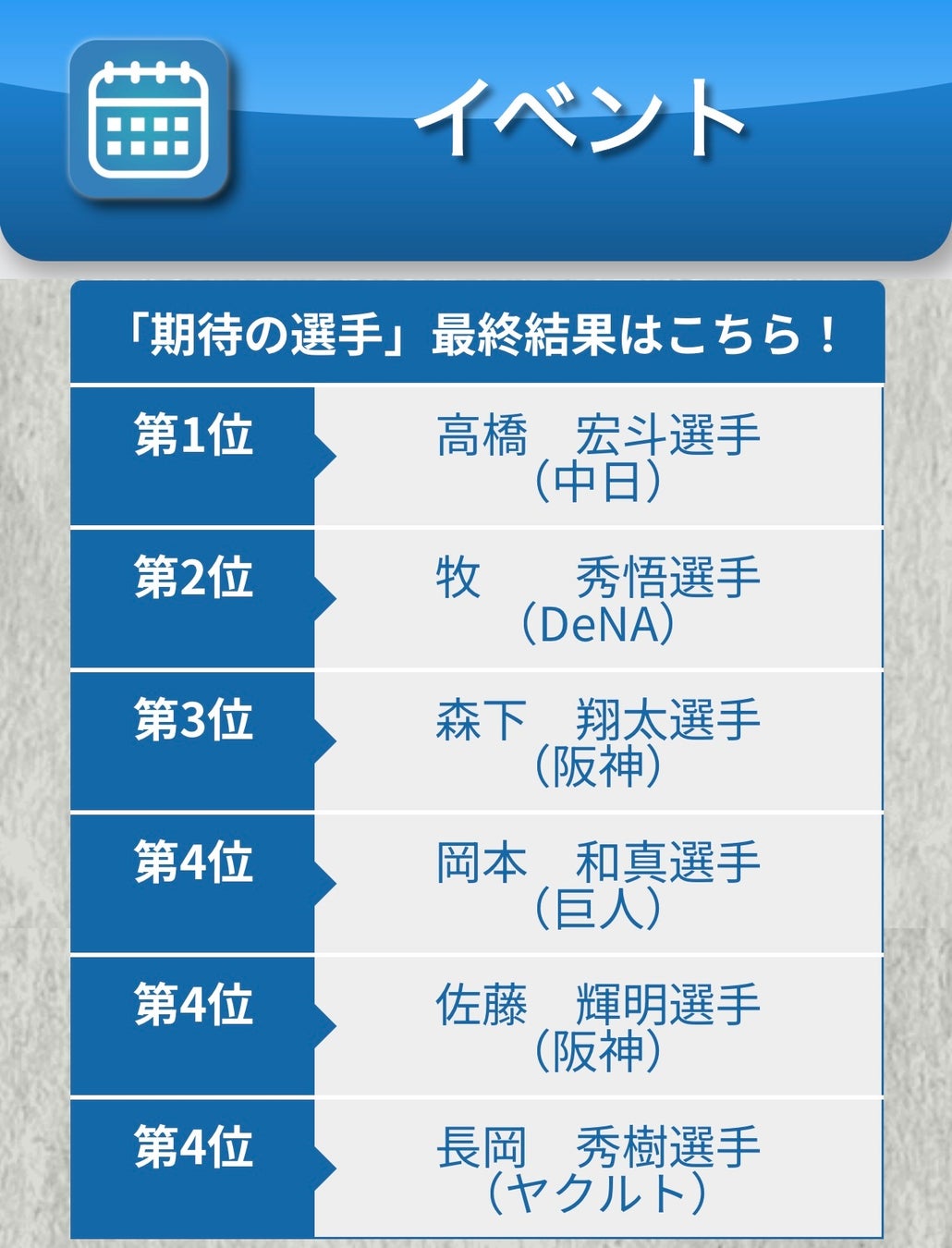 ここでは、スマートフォンアプリ「日刊スポーツ プロ野球選手名鑑タップ!2023」内で行われたイベント「今季期待の選手投票」の結果を発表します。
