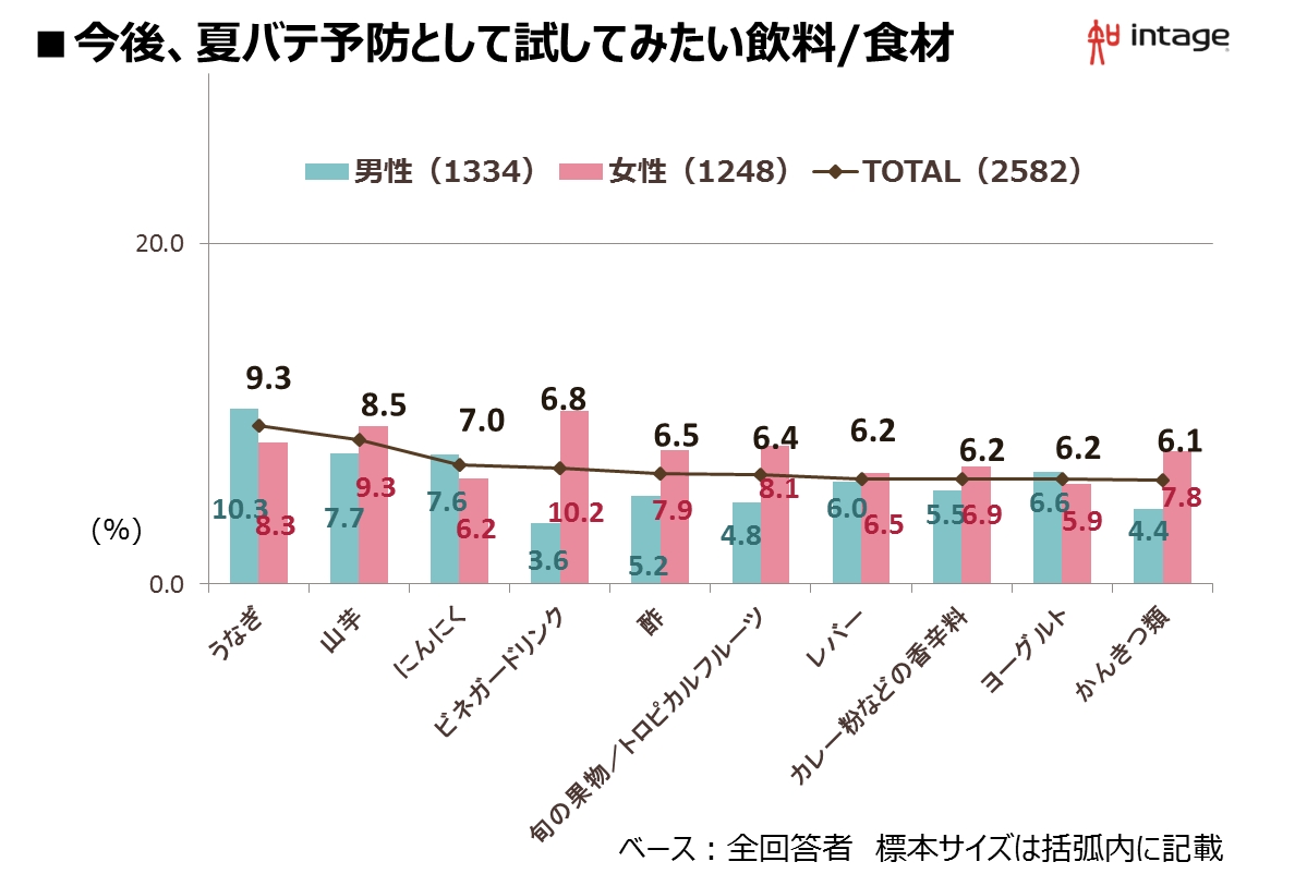 最後に、「これまで取り入れたことはないが、今後、夏バテ予防として試してみたい飲料・食材」について聞くと、食材で全体トップ3は「うなぎ」「山芋」「にんにく」と滋養系食材が並びました。飲料では、女性が「ビネガードリンク」を多く選択。最近は、各メーカーから飲用を目的にした飲みやすいビネガードリンクが数多く発売されていることも、今回の結果と関連がありそうです。