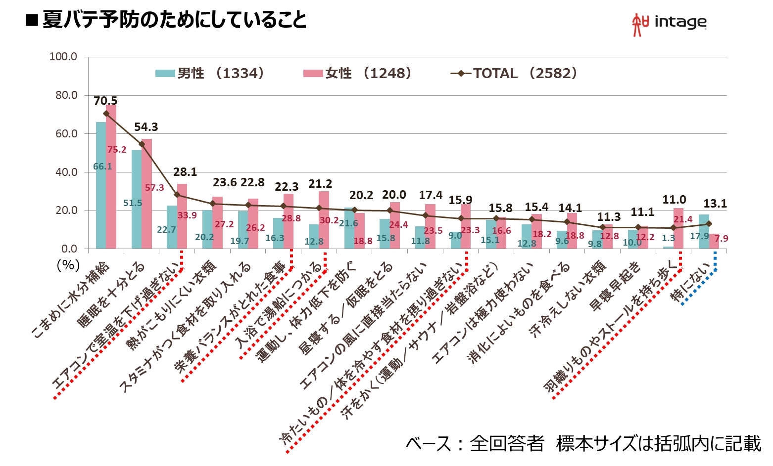全体で最も多かったのは、7割が回答した「こまめに水分補給」。次いで「睡眠を十分にとる」も過半数が回答。熱中症対策と同時に、十分な休息が夏バテ予防として重視されていることがうかがえる結果となりました。