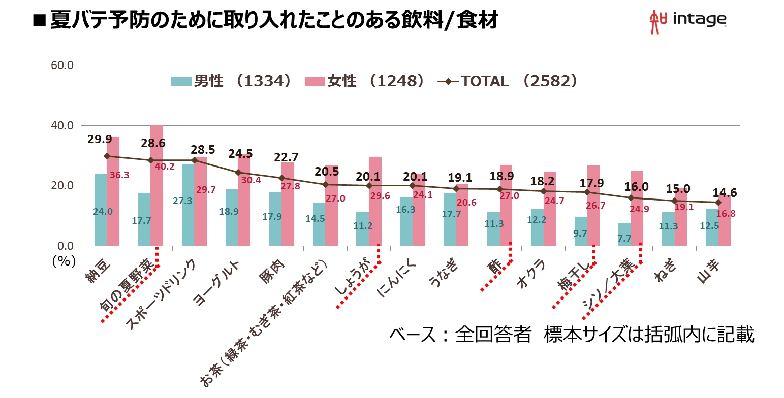特に、女性は各項目とも男性よりも選択率が高い傾向にあり、日々の飲食で夏バテ予防を男性以上に心がけていることがわかります。また、体を温めることで知られる「しょうが」を、女性の3割が取り入れています。これは、女性にとっての夏バテ予防のキーワードが、空調による"冷え"であると推察されます。