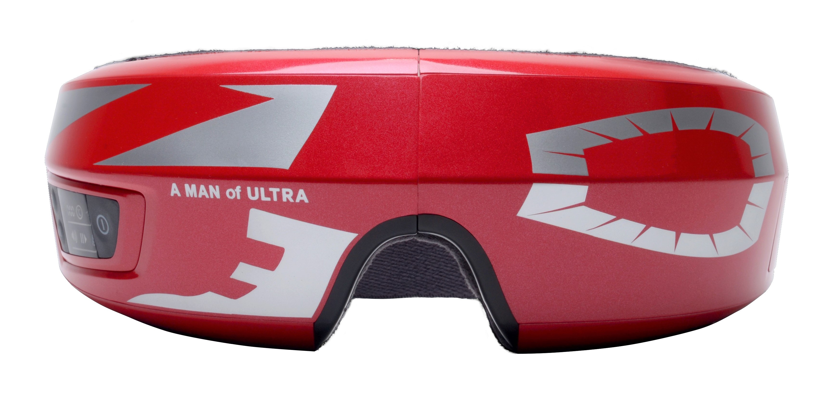 一方の「3Dアイマジック|ウルトラセブン」は、超小型のエアバッグによる加圧のほか、バイブレーション・温熱・サウンドという4つの機能を搭載。パソコンやスマートフォンの使用で疲れやすい目元周辺を癒してくれるヒーリングツールです。本体は「ウルトラレッド」がベースになっており、変身アイテム「ウルトラアイ」を彷彿させるモチーフに、アイスラッガーと「7」もシンボリックに配置されています。
