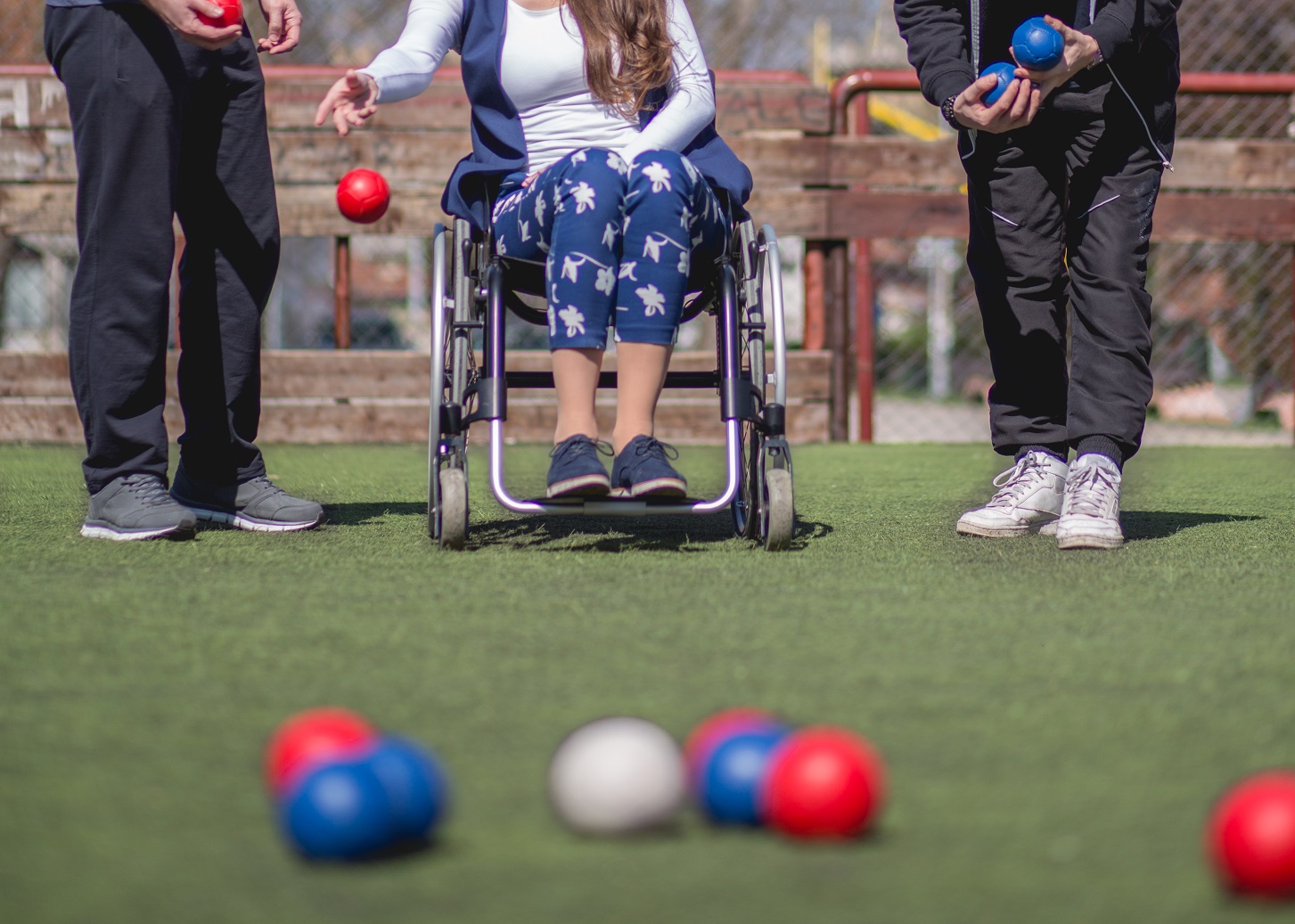 ボッチャは、ヨーロッパで生まれた重度脳性麻痺者もしくは同程度の四肢重度機能障がい者のために考案されたパラリンピック競技です。ジャックボール(目標球)と呼ばれる白いボールに、それぞれ6球ずつ用意された赤・青のボールをいかに近づけることができるかを競いあいます。