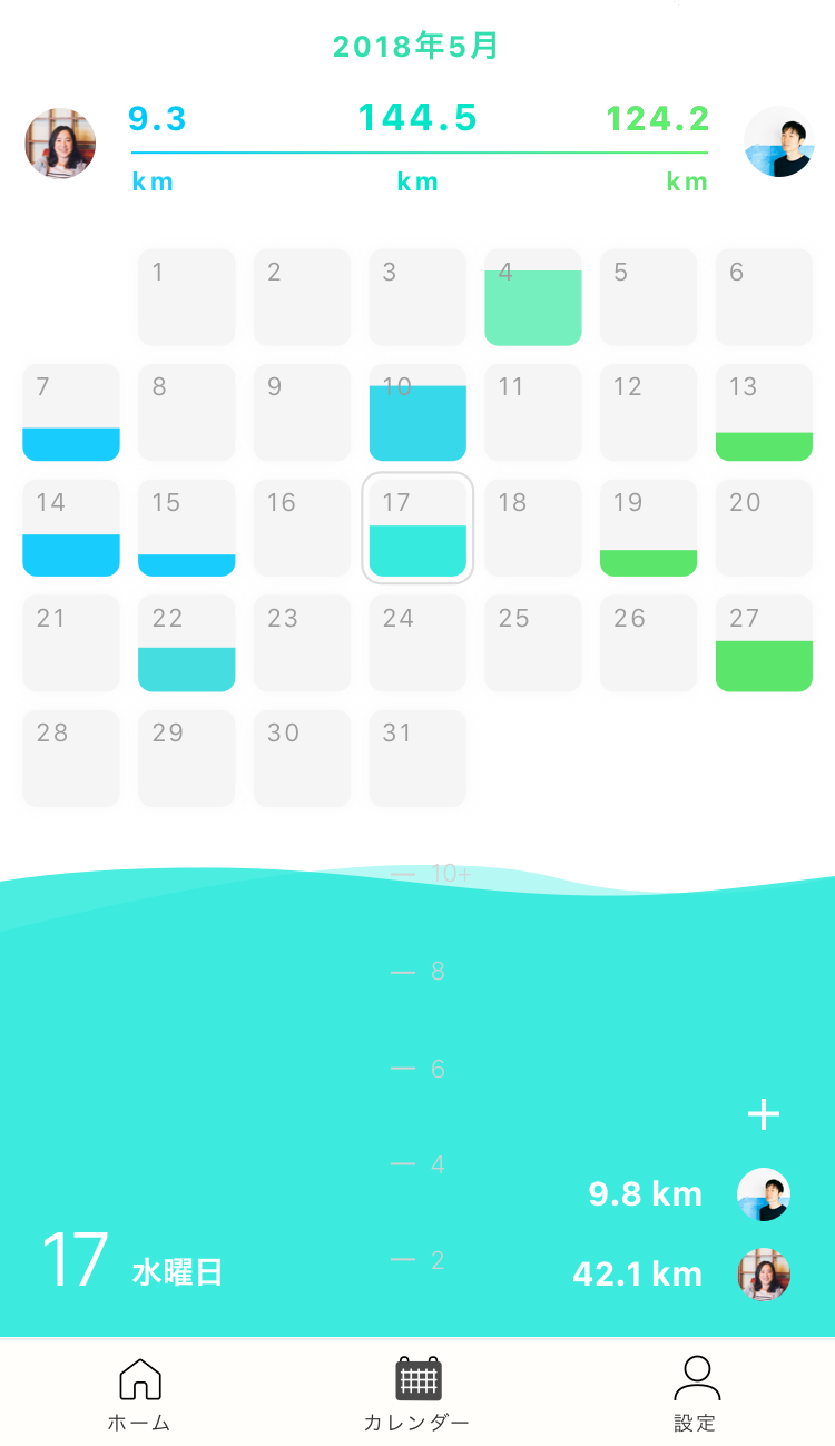 アプリで互いのランニング記録が共有できるほか、相手のランニングの状況をリアルタイムでトラッキング(追跡)できたり、2人のランニングを一緒に記録できるカレンダーがあったり。