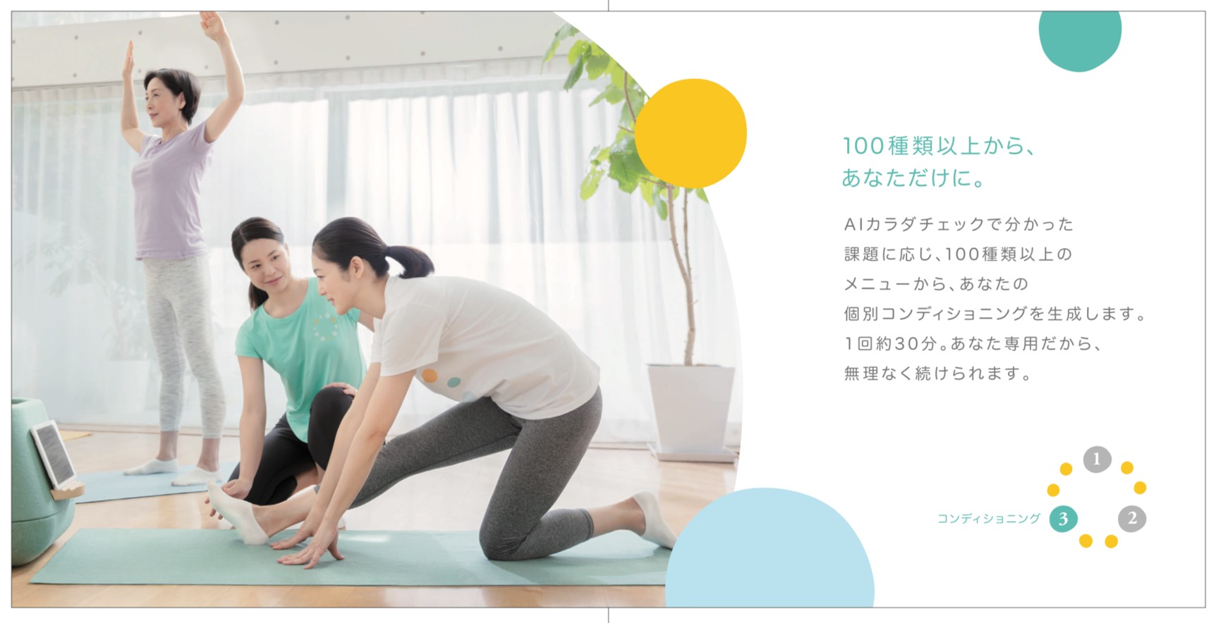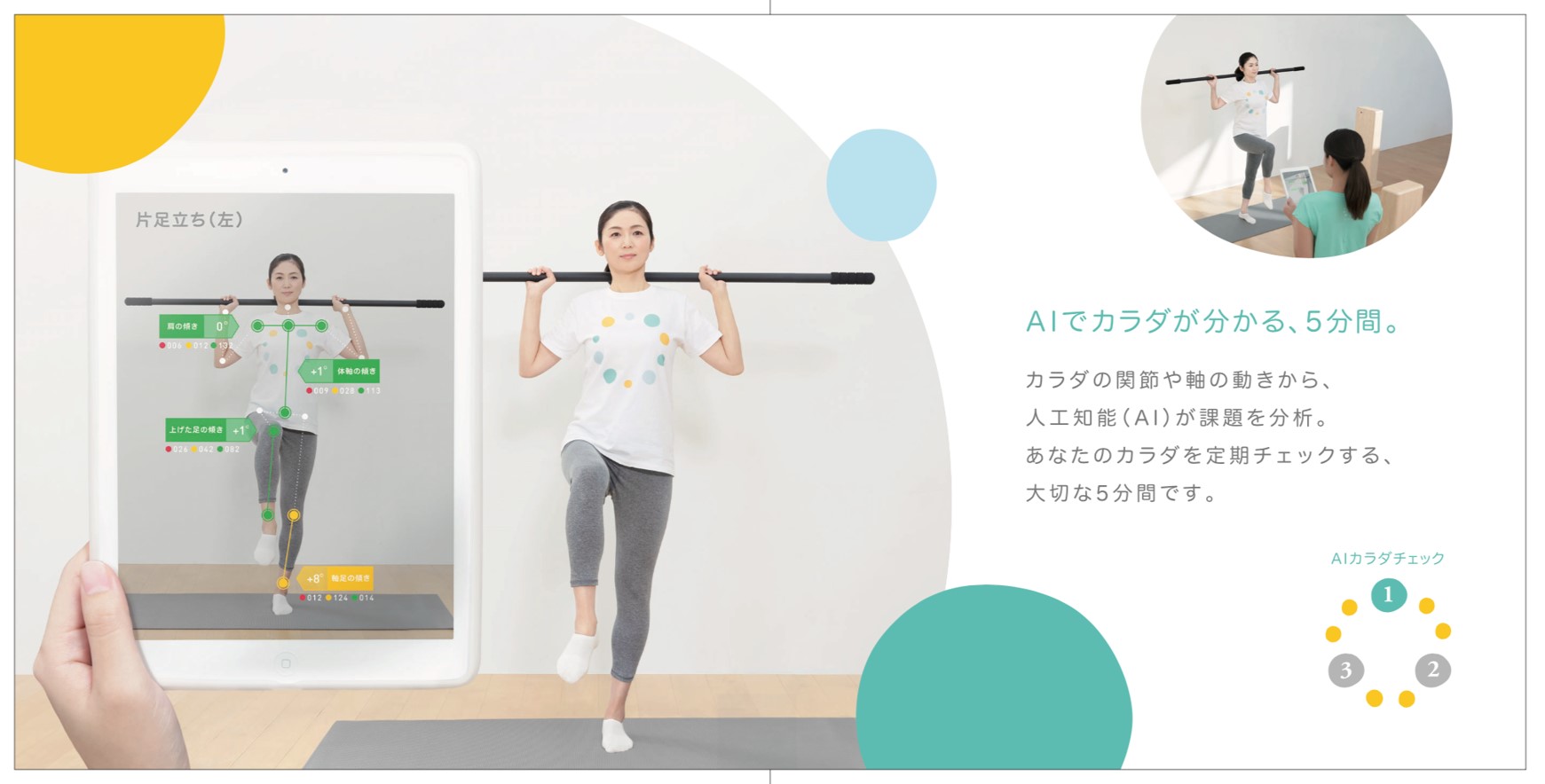 「カラダチェック」と名付けられたこのプロセスでは、体組成計や歩行分析、さらには5つのポーズを撮影することにより、姿勢・バランス・柔軟性・カラダの動かし方などから、「肩(左右)・胸椎・腰椎・股関節(左右)・膝(左右)・足(左右)」の合計10ヶ所で、ユーザーのどこに弱点があるのかを判定します。