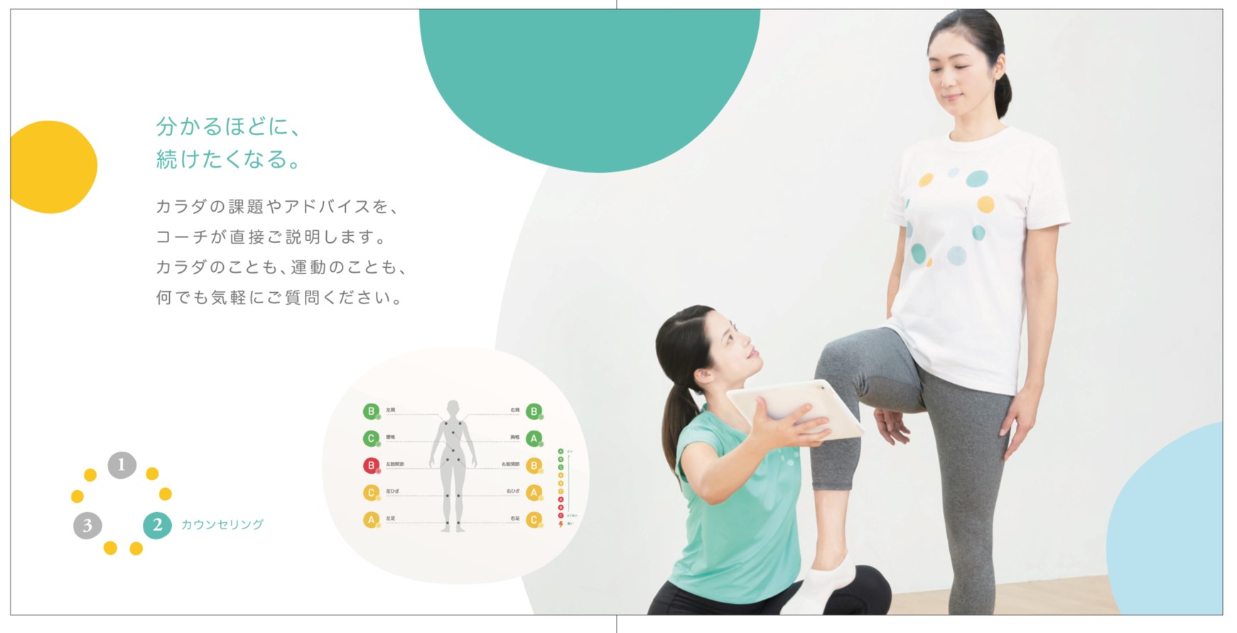 そして、その後には「カウンセリング」も実施。先の「カラダチェック」による科学的な分析と、コーチによるカウンセリングにより、個々のカラダの課題を確認。最適なトレーニングを導き出してくれるというわけです。