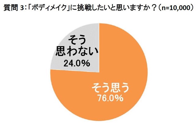 美ボディを目指す一環として、トレンドとなっている「ボディメイク」についても質問しています。 「『ボディメイク』に挑戦したいと思いますか?」との問いには、8割近くの女性が「そう思う」(76.0%)と回答。もはやボディメイクは多くの女性にとって関心ごとであることが分かります。
