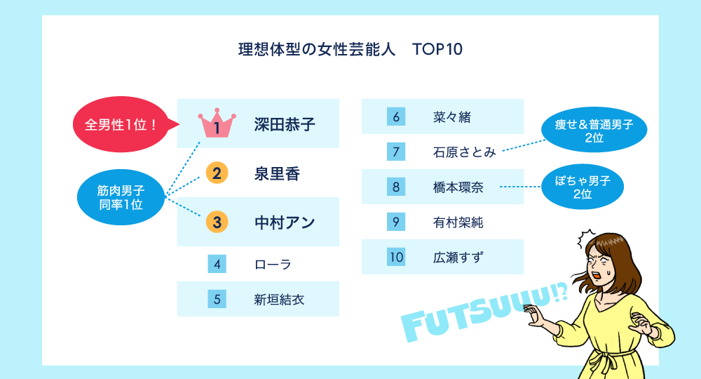 男性が求める"普通体型”というのがどのくらいのものなのか気になるところですが、参考に理想体型の女性芸能人について聞いたところ、1位が深田恭子さん、2位が泉里香さん、3位が中村アンさんという、どちらかといえば、引き締まった身体の女性芸能人に票数が集まりました。「それ、普通体型じゃない」という女性陣からの声が聞こえてきそうですが、男性陣はジャッジが厳しめ?
