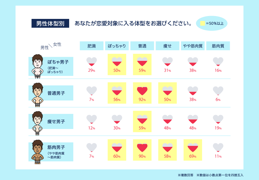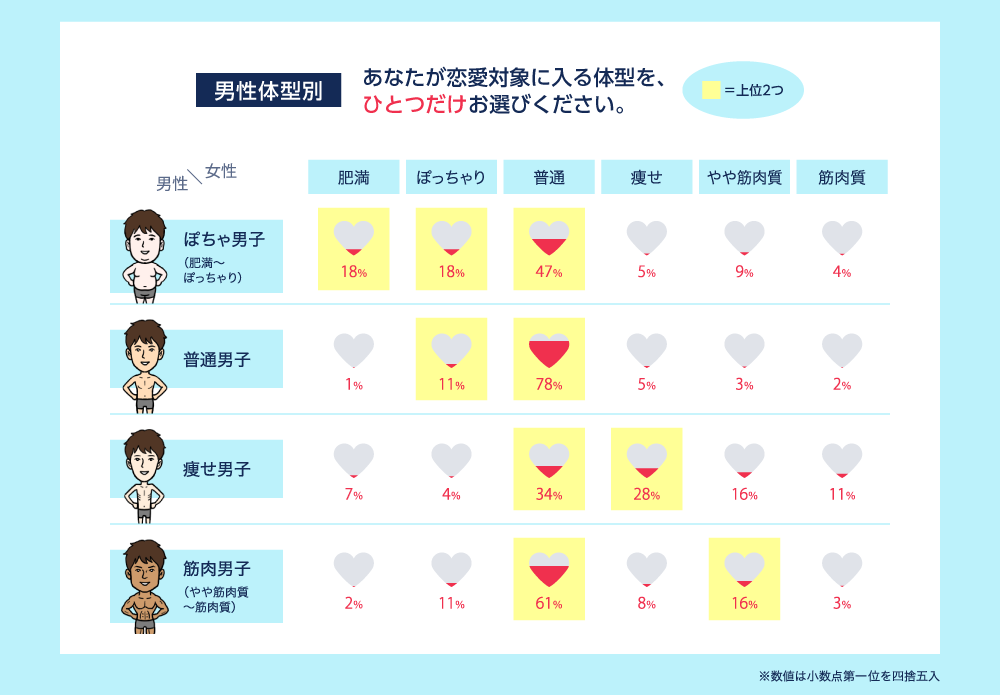 肥満~ぽっちゃりの"ぽちゃ男子"は、「肥満体型」(18%)の女性が恋愛対象に入る人が多いことが見て取れます。なお、どの体型でも「普通体型」を好んでいるものの、それ以外の体型では、自分に近い体型を好む傾向にあることが分かりました。