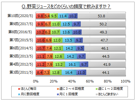 同社の実施する野菜ジュースに関する調査は定例実施で、今回が10回目。健康志向の高まりとともに、人気はうなぎのぼりかと思いきや、実は飲用頻度が2012年以来減っているというのは興味深いポイント。最新の調査によれば、野菜ジュースを飲む人は全体の5割弱。2017年からは半数をやや下回る結果になっています。