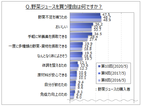 最後に、野菜ジュースの購入理由についても見てみましょう。もっとも多かったのは「野菜不足を補うため」で、購入者の47.5%が回答。「おいしい」「手軽に栄養素を摂取できる」といった答えが各30%台、「一度に多種類の野菜・果物が摂取できる」「なんとなく体によさそう」が各2割と続きました。