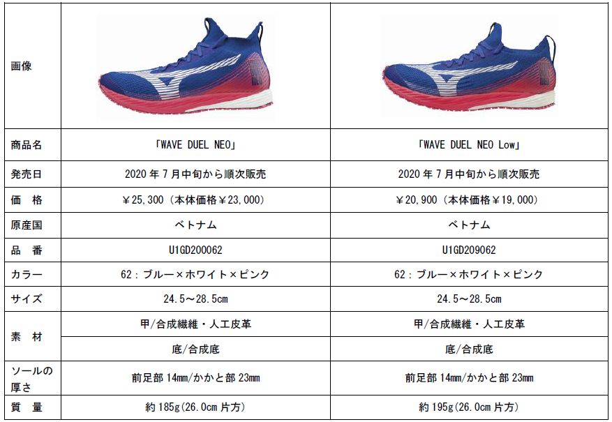 WAVE DUEL NEOは税込25300円。ローカットタイプのWAVE DUEL NEO Lowは税込20900円で、7月中旬から全国のミズノ品取扱店で順次発売されます。商品の概要は、次の通りです。