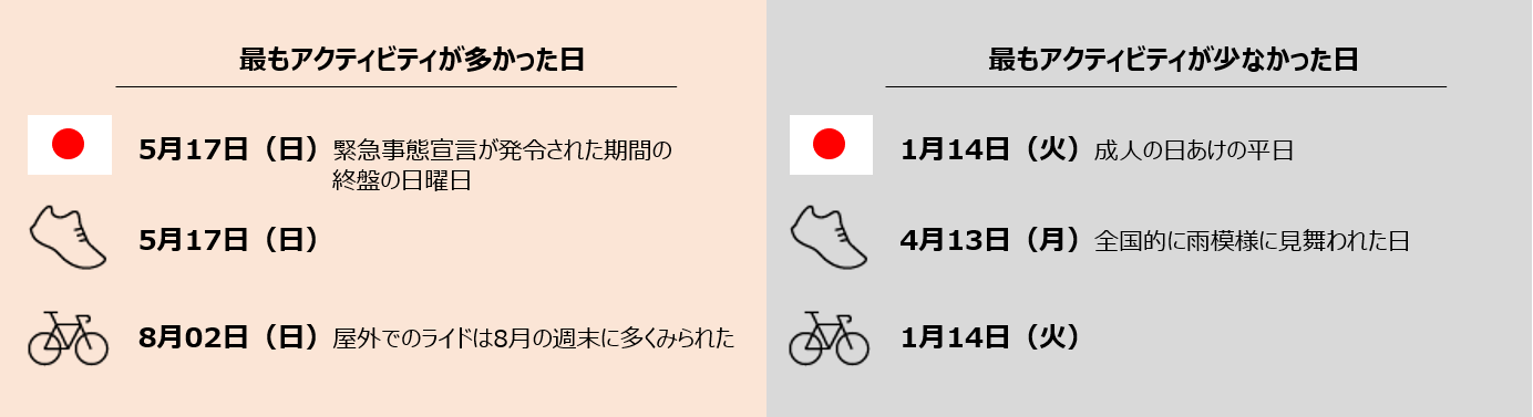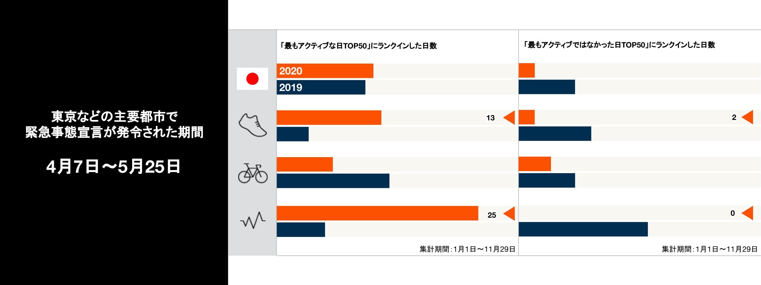 「もっともアクティブでなかった日TOP50」にランクインした日数が大きく減った点も注目すべきポイント。これは、在宅ワークや外出の自粛が呼びかけられた期間中、ランニングやインドアでのアクティビティに励んだアスリートが多かったことが背景にありそうです。