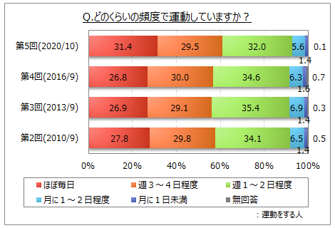 今回の結果によれば、運動をしている人は4割強という結果に。前回2016年調査時と比較すれば微増傾向、2010年と比較するとやや減少という数字があらわれています。
