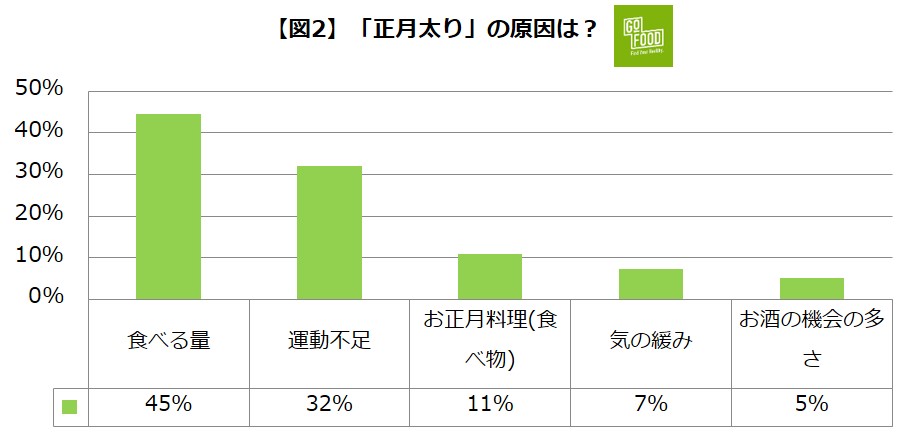 調査結果によれば、約8割が「正月太り」を経験したことがあると回答。その原因については、「食べる量」が多いことをあげる人が約45%という結果になりました。