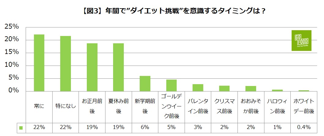 そうした背景もあって、1年の中でもっともダイエットを意識するタイミングは「正月前後」が最多という結果に。新年に心機一転、何かをはじめようとする気持ちが高まっていることも要因として考えられます。