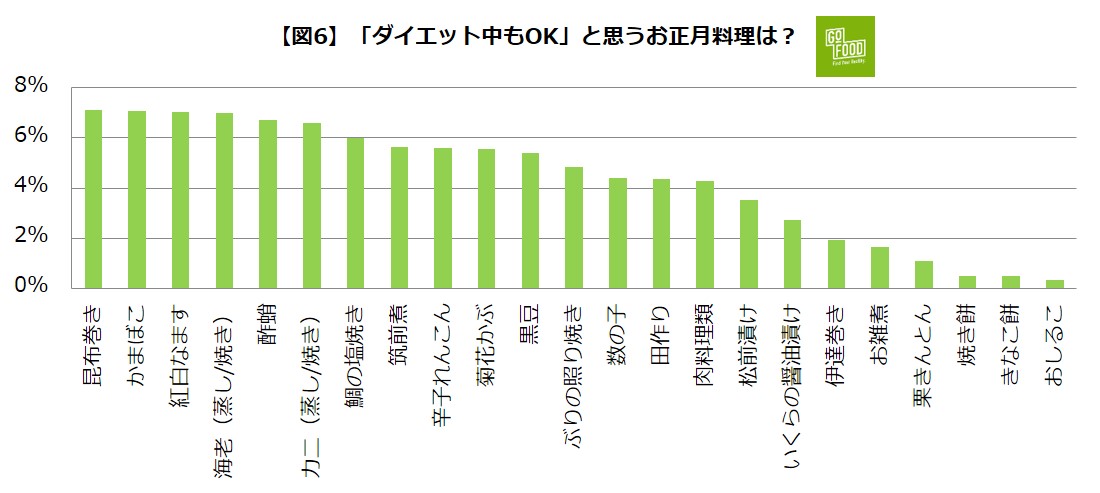 反対に「ダイエット中もOK」だと思うお正月料理については、「昆布巻き」「かまぼこ」「紅白なます」がトップ3という結果になりました。