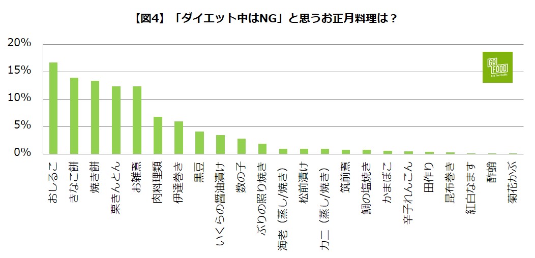 次に、「ダイエット中はNG」だと思うお正月料理は、「おしるこ」「きなこ餅」「焼き餅」がトップ3。共通事項は「お餅」。やはり、糖質が高いお餅は警戒すべきだと多くの人は認識しているものの、そこを我慢できるか……。