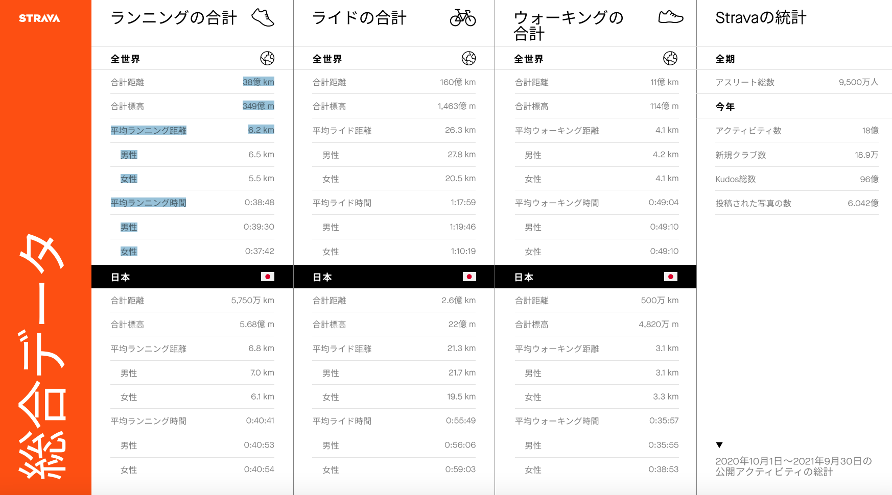 ほか、世界と日本のアクティビティを比べてみると、日本はとくにランニングが人気。世界の平均ランニング距離が6.2キロであるのに対し、日本は6.8キロとなっています。