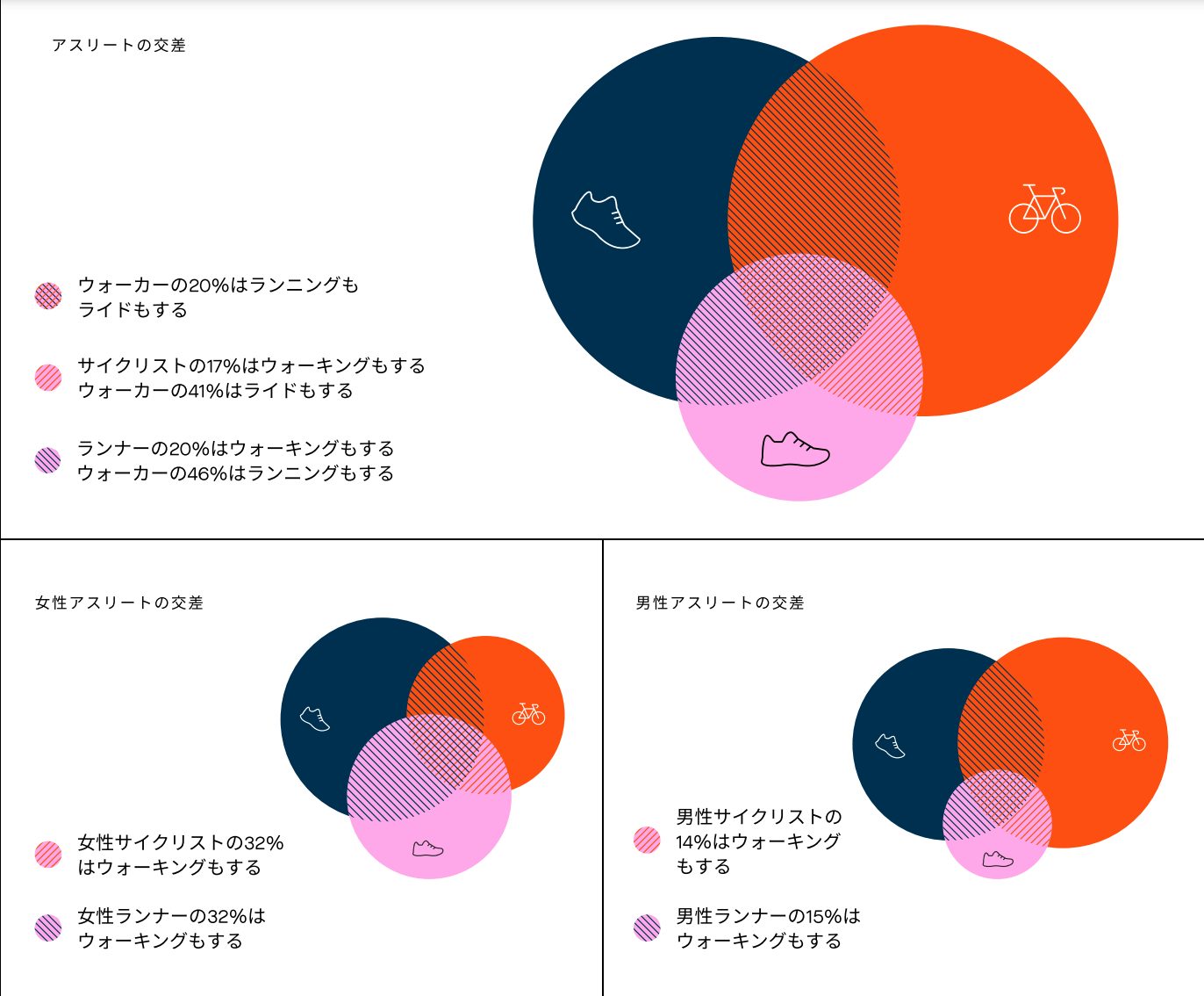 また、同社はウォーキングとランニング・サイクリングの親和性についても指摘。ウォーキングだけを記録するアスリートが一定数いる中で、Strava上では、ウォーキングをする人の3分の2はランニングやサイクリングも行っているといいます。特に女性のランナーとサイクリストは、男性の2.4倍もウォーキングをアップロードするなど熱心です。