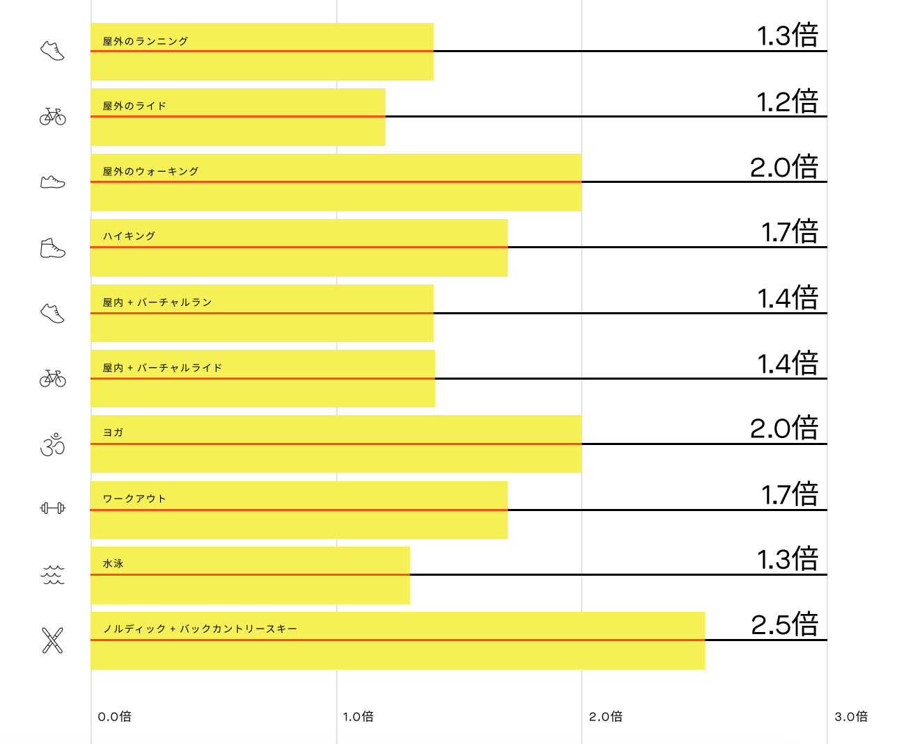 スポーツのタイプ別では、ウォーキングとハイキングが、ヨガやインドアトレーニングと並んで堅調な伸びを記録。