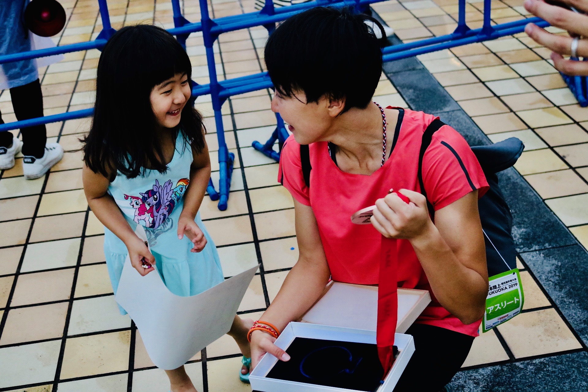 表彰式を終え、家族のもとへやってきた寺田選手。果緒ちゃんに、「金メダルじゃなくて銅メダルだったよ〜」と言いながらメダルを首にかけました。