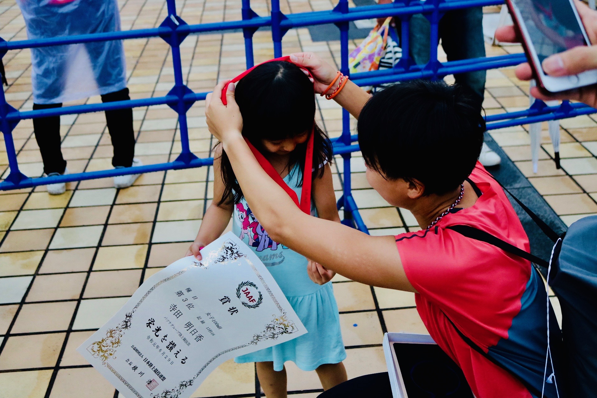 ▲ママから娘へ、メダルのプレゼント