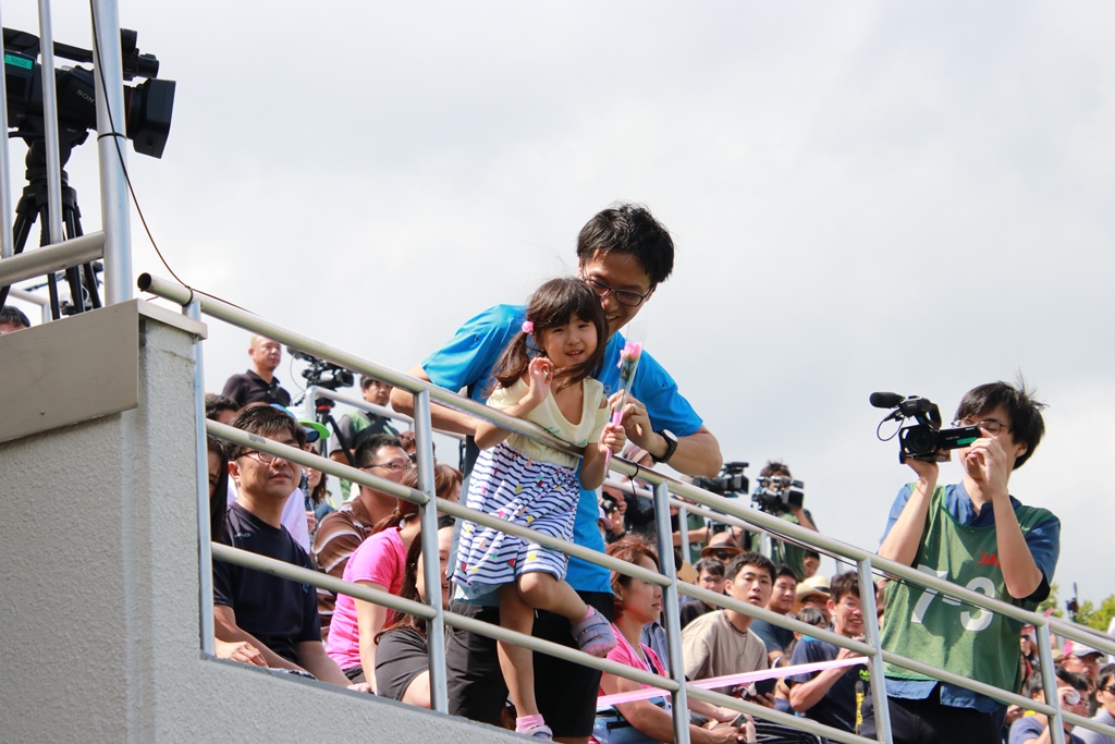 レース後、寺田選手はいつも支えてくれる娘・果緒ちゃんと夫・峻一さんのもとへ。「ママ、おめでとうー!」と長女の果緒ちゃんがフィールドにいる寺田選手へ声をかけると、寺田選手は「ありがとう!」と答え、アスリートの顔から一瞬にしてママの表情に変わりました。