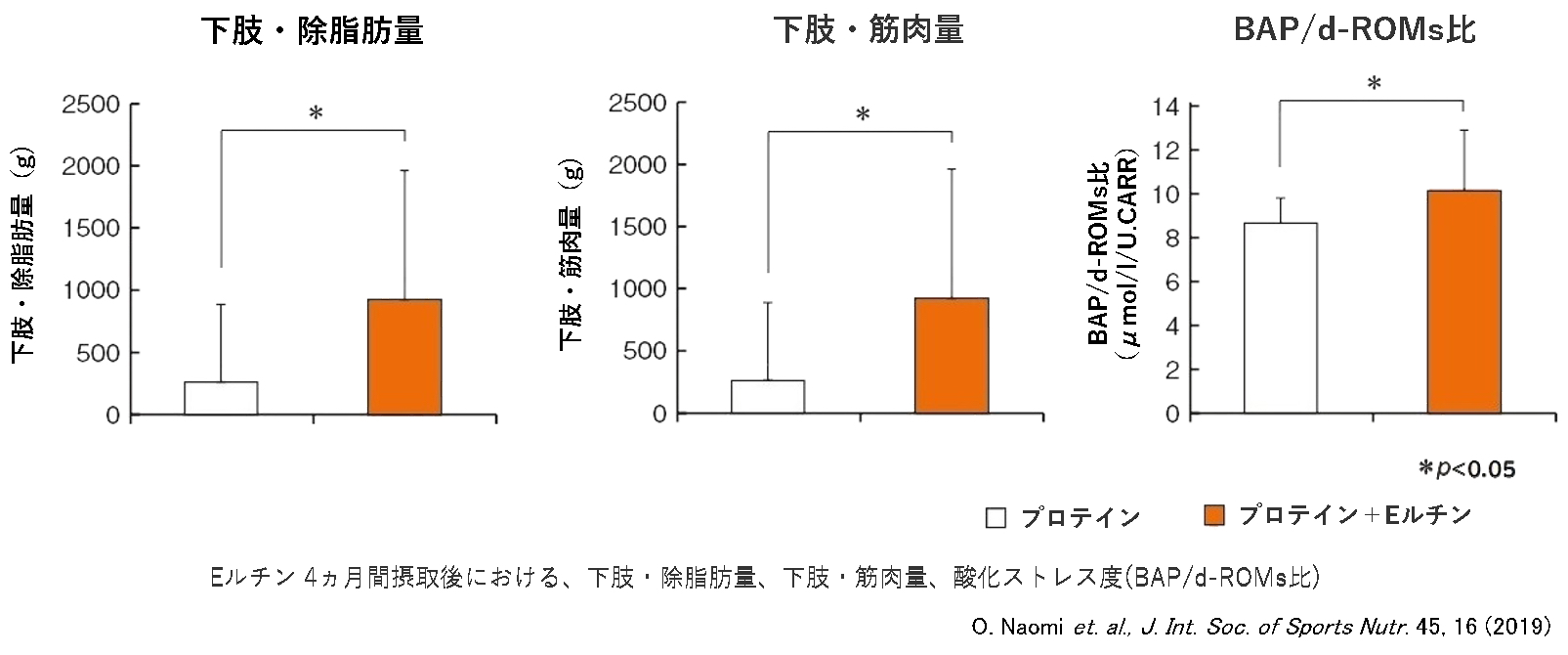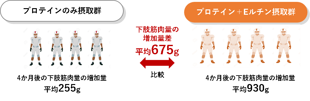 これらの効果は、研究者の行ったいくつかの実験でも明らかになっています。アメリカンフットボール部に所属する男子大学生39名を対象にした4か月間の試験では、プロテイン20gを摂取する群と、プロテイン20g+Eルチン42mgを摂取する群に分け、体重、体組成、酸化ストレス度を測定しました。すると4か月後、Eルチンを摂取した群は下肢筋肉量の増加量が著しく、血中の抗酸化能の指標などにも好結果が出ました(出典「N. Omiet al.:J. Int. Soc. of Sports Nutr.45, 16 (2019)」)。