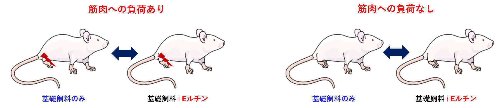 また筋肉に負荷を与えないグループでも「基礎飼料のみ」より「基礎飼料+Eルチン」の方が筋線維横断面積の肥大が見られました。このことより、Eルチンを摂取していれば日常生活レベルの運動刺激でも筋肉を肥大できる可能性があることが判明しました。