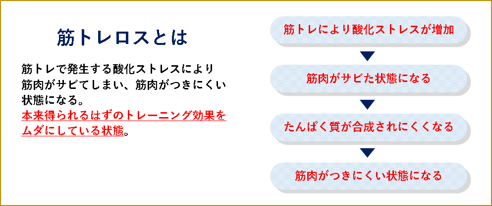 頑張ってトレーニングをしていても、なかなか成果が出ない……と悩んでいる人が知っておきたいこととして、「実は筋トレがムダになってしまうことがある」ということなんです。激しい運動や筋トレなどによって筋肉に強い負荷をかけると、体内には活性酸素が発生します。これが体内の抗酸化力を上回って酸化ストレス状態に陥ると、筋肉のたんぱく質は酸化され、筋肉が本来の力を発揮できなくなります。このような“筋肉が錆びた”状況が続くと、いくらトレーニングしても筋肉がつきにくい“筋トレロス”になってしまうと考えられています。
