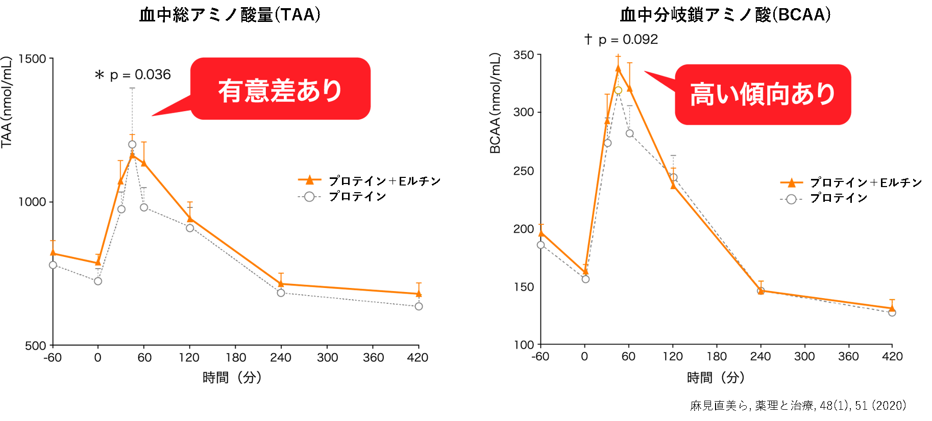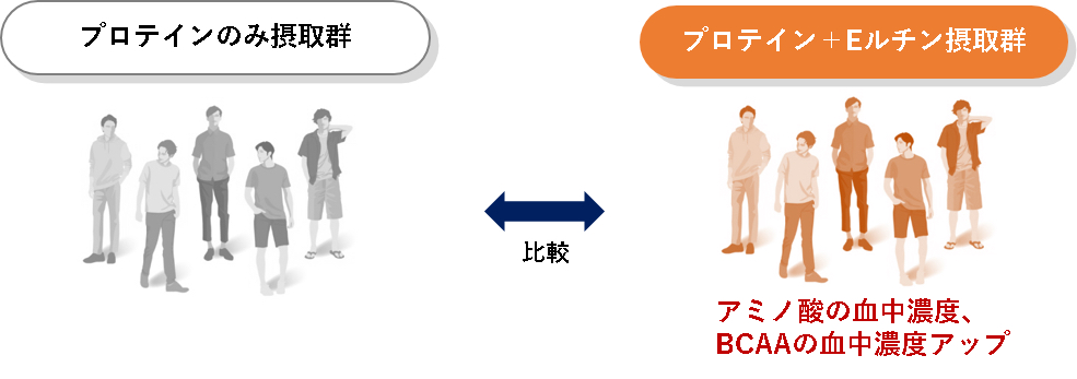 また健康な成人男性10名を対象に、プロテイン20gのみ摂取する場合と、プロテイン20g+Eルチン42mgを摂取する場合に分けて、たんぱく質(アミノ酸)の消化・吸収に及ぼす影響を検証しました。その結果、プロテインとEルチンを同時摂取することでアミノ酸の吸収が促進され、運動時の筋合成に効率的に働く可能性があることが分かりました(出典「麻見直美ら, 薬理と治療, 48(1), 51 (2020)」)。
