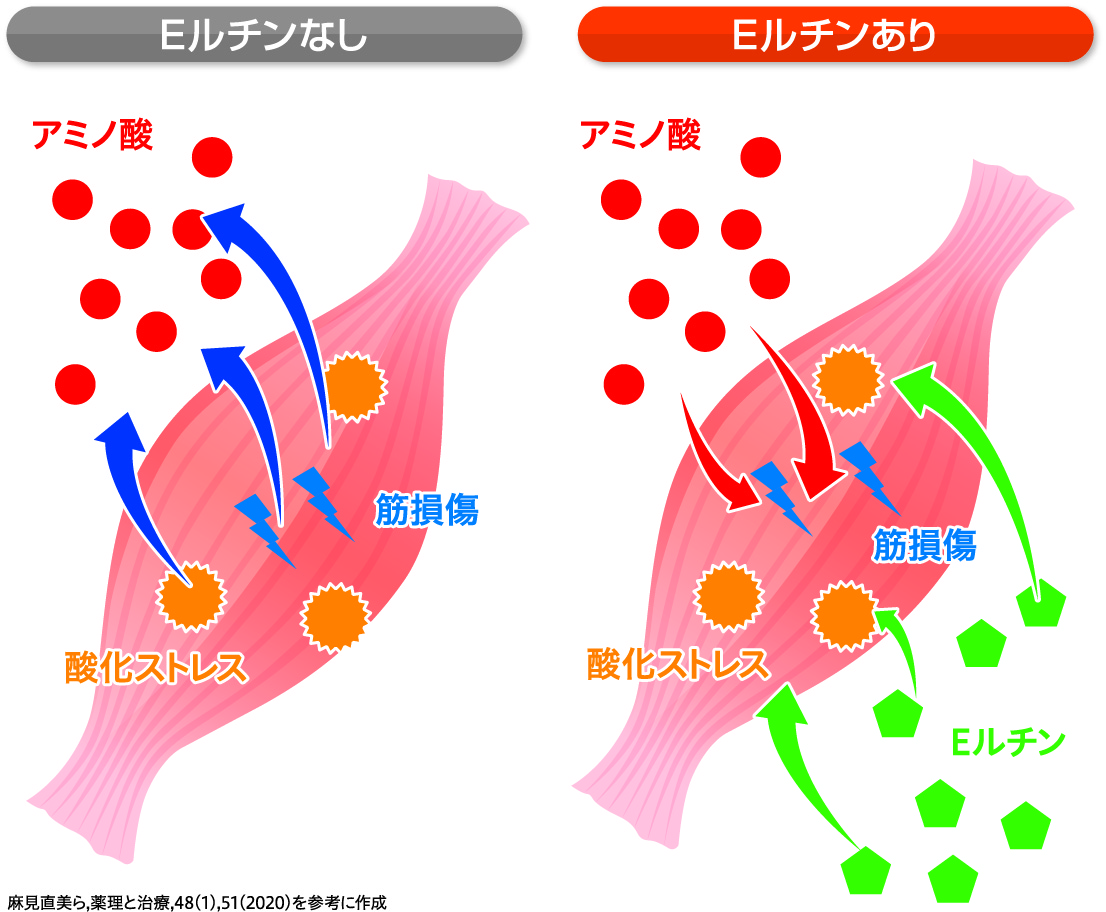 ▲Eルチンが酸化ストレスを改善するので、たんぱく質合成に必要なアミノ酸を充分に使えるようになる