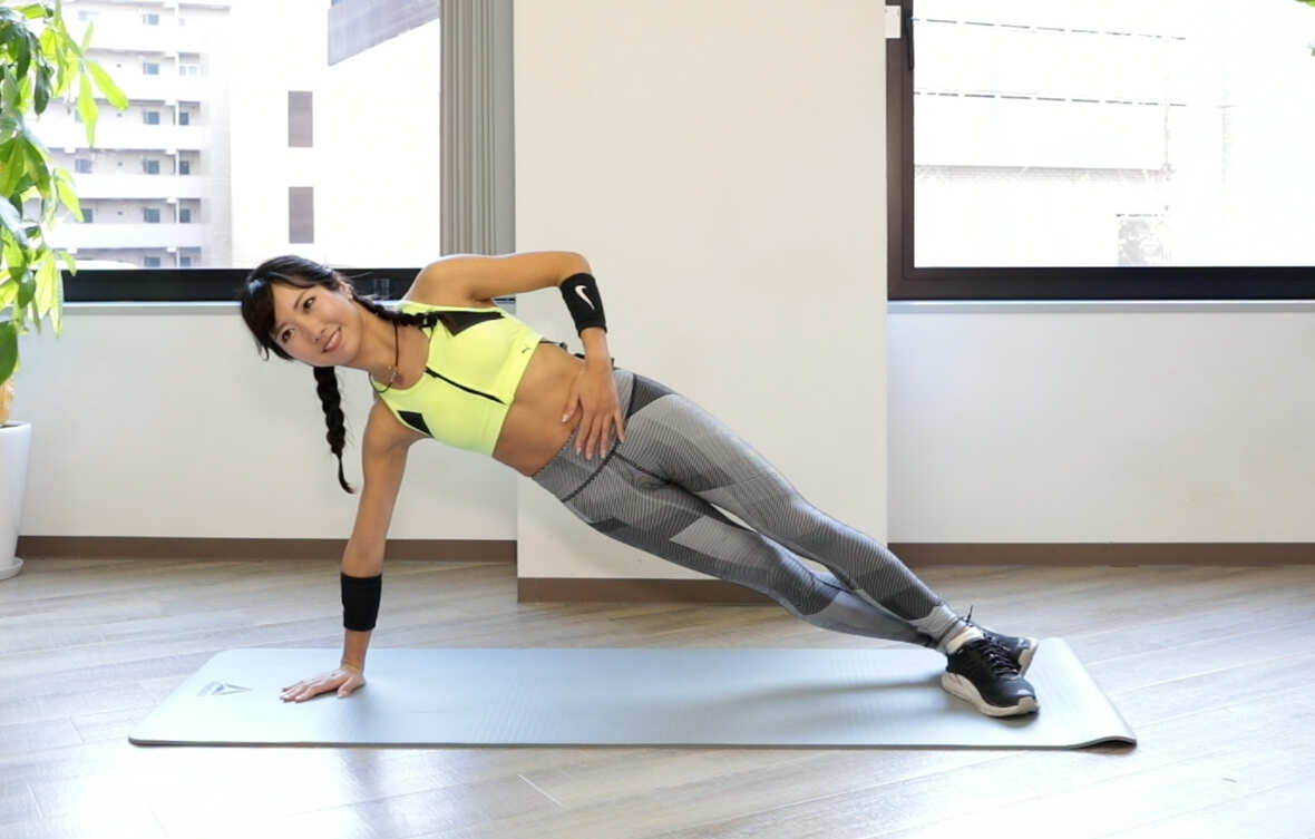 肘をついた姿勢のサイドプランクに対して、こちらは腕を伸ばした姿勢となります。脇腹の筋肉を重点的に鍛えることができます。