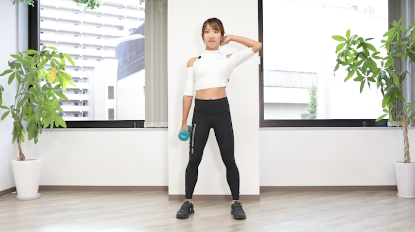 - 胸を張って片手は頭の後ろに添え、ダンベルを持っている方向に体を倒していく