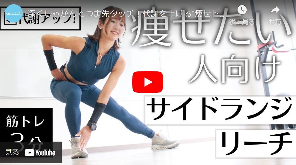 下半身に効く「サイドランジリーチ」。お尻との筋肉「大殿筋」と太ももの筋肉「大腿四頭筋」を集中的に追い込むことができます。「大殿筋」と「大腿四頭筋」は体の中でも大きな筋肉で、鍛えることで代謝アップが望めます。痩せて理想のシルエットを目指したい方に、おすすめのトレーニングです。