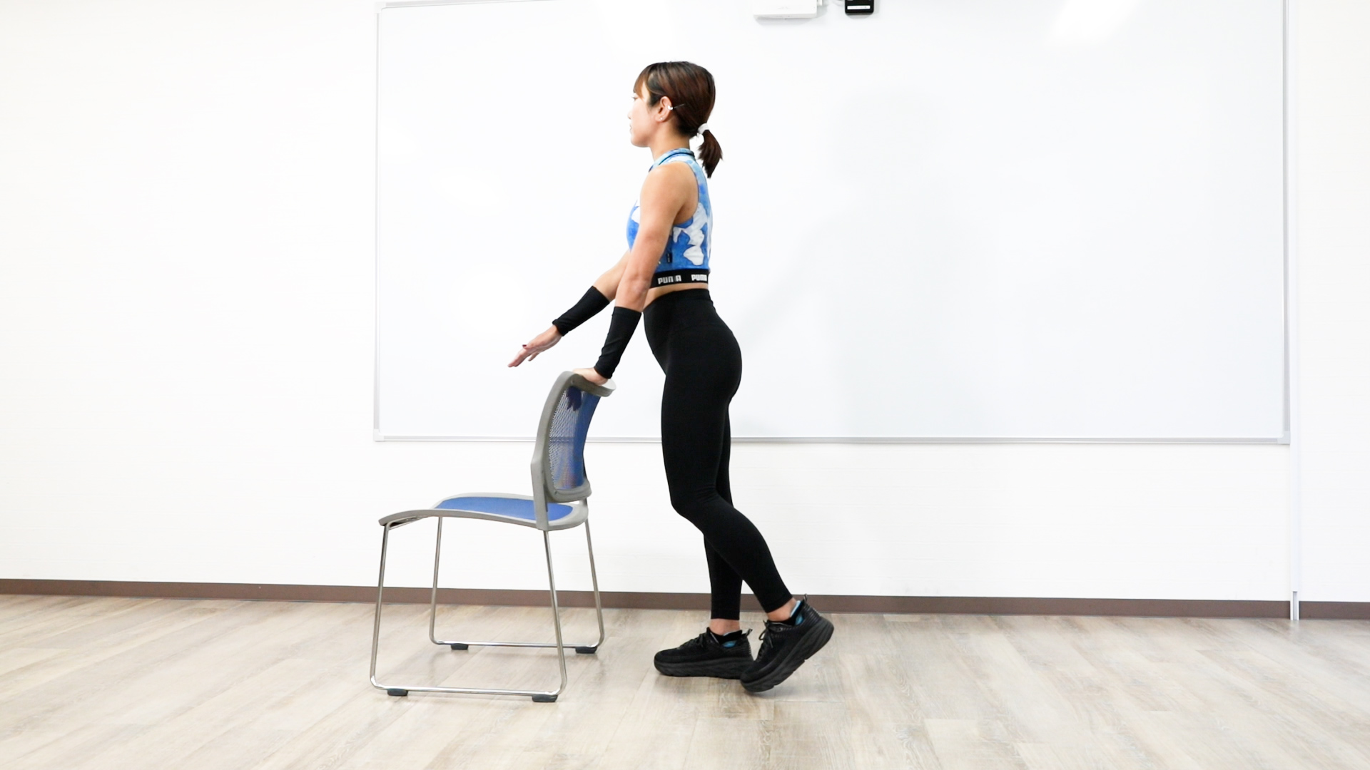 - イスなどの背に手をかけて背すじを伸ばして立つ。