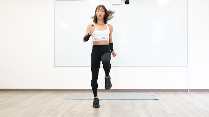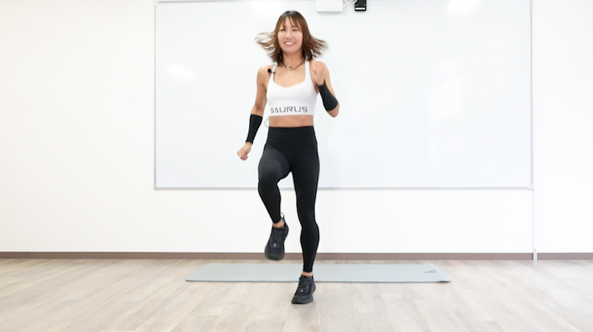 - かかとを少し上げ、右左交互にふとももを持ち上げる。腕も同時に振る
